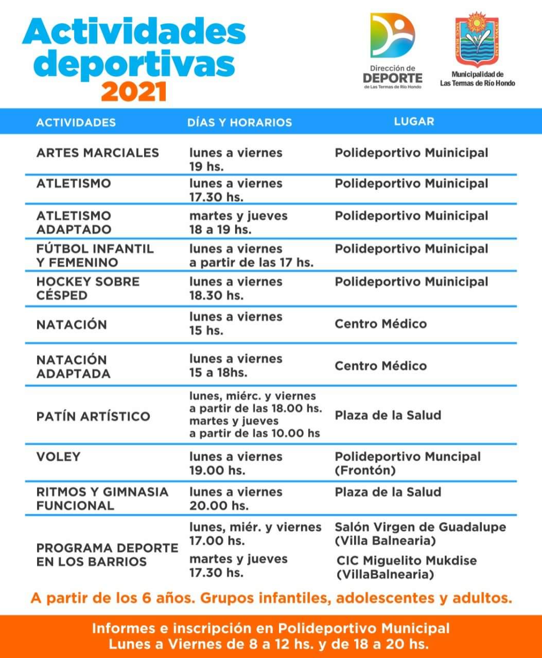 Informes e inscripciones de lunes a viernes de 8 a 12 y de 18 a 20 hs. en el Polideportivo Municipal.