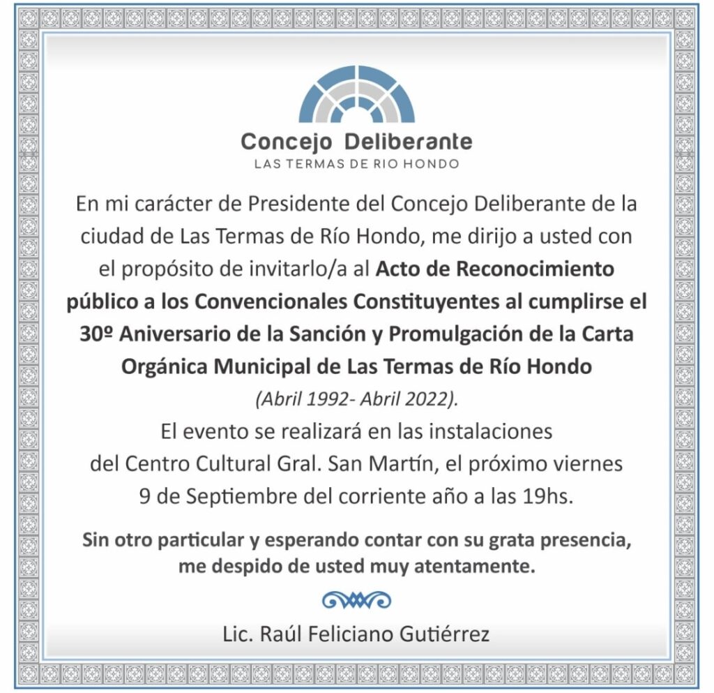 En el marco del 30° aniversario que se cumplió en el mes de abril del corriente año de la sanción y promulgación de la Carta Orgánica Municipal, el Concejo Deliberante de Las Termas de Río Hondo realizará este viernes, a partir de las 19 un acto de Reconocimiento público a los Convencionales Constituyentes.