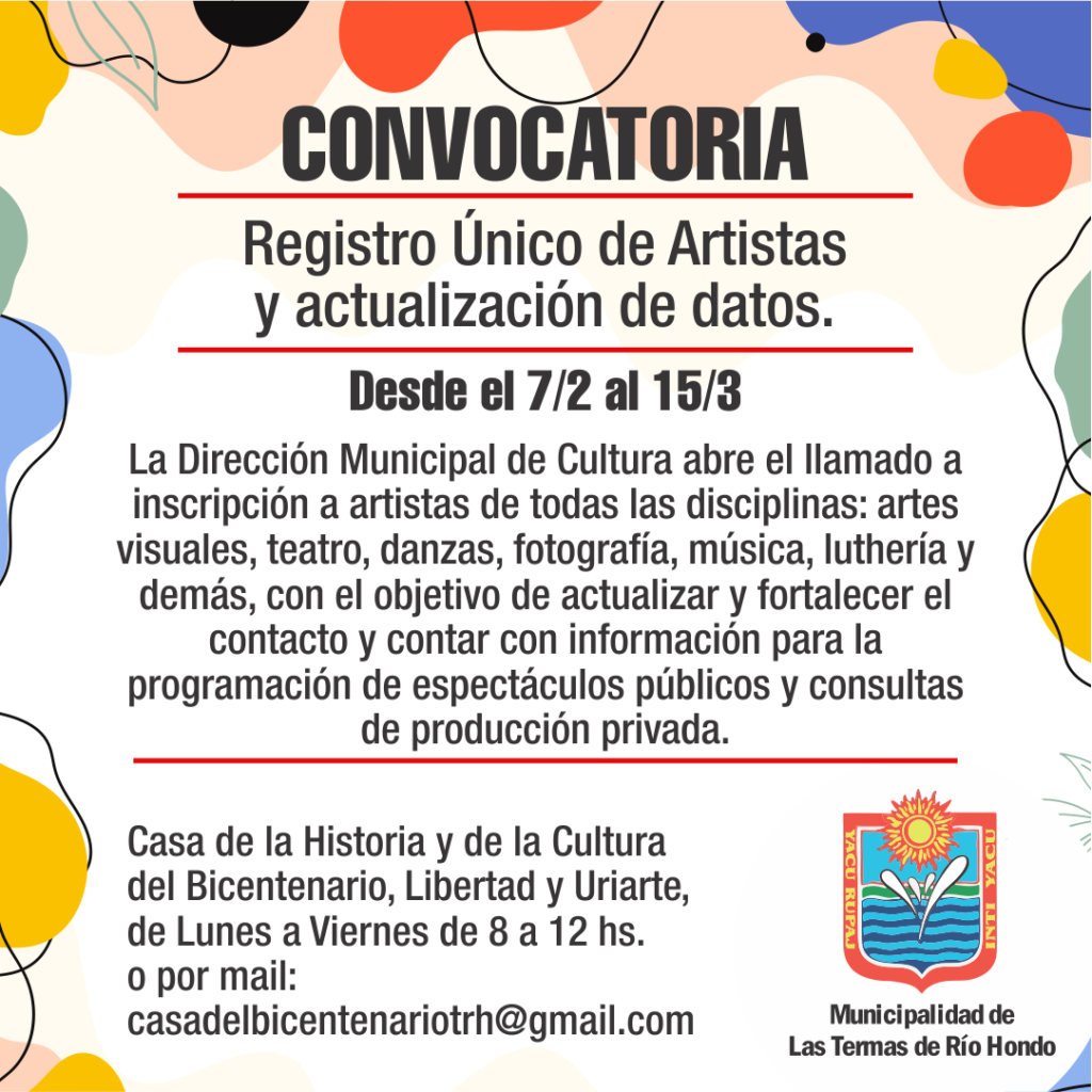Por cuarto año consecutivo la Dirección de Cultura de la Municipalidad abre la convocatoria a artistas locales de todas las disciplinas a inscribirse (o actualizar datos de contacto) en el Registro Único de Artistas, con el objetivo de fortalecer el vínculo y contacto y contar con información para la programación de espectáculos públicos y consultas de producción privada.