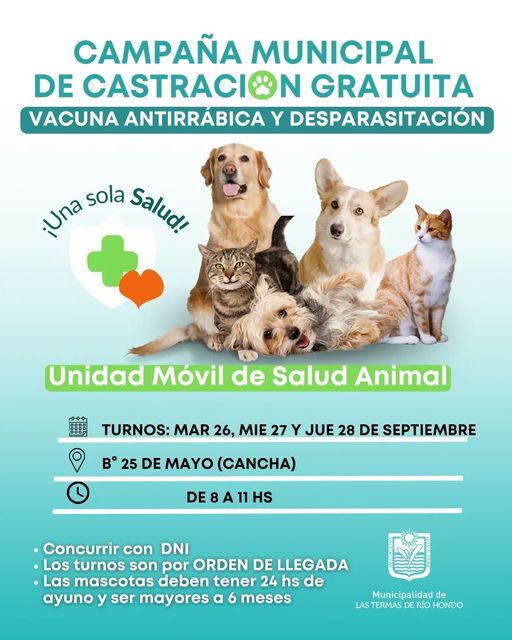 La Campaña de Castración, Vacunación Antirrábica y Desparasitación Gratuita estará presente este 26, 27 y 28 de septiembre de 08 a 11 horas en la Cancha del Barrio 25 de Mayo.