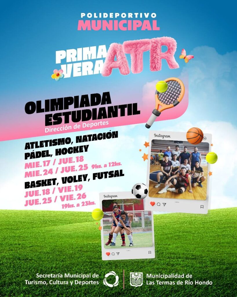 Además se realizarán las Olimpiadas Estudiantiles con propuestas deportivas para los jóvenes en el Polideportivo Municipal y el Estadio Cubierto, con atletismo, natación, pádel y hockey, el miércoles 17 y jueves 18 de 09 a 12 horas. Las categorías de básket, voley y futsal serán los días jueves 18, viernes 19, jueves 25 y viernes 26 de septiembre de 19 a 23 horas.