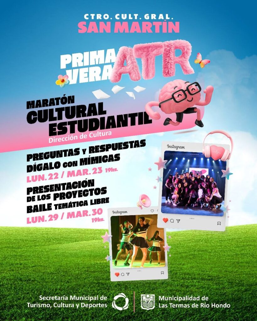 Maratón Cultural Estudiantil a cargo de la Dirección de Cultura, se desarrollará el lunes 22 y martes 23 a partir de las 19.00 horas con los concursos de “Preguntas y Respuestas” y “Dígalo con Mímicas”, y el lunes 29 y martes 30 de septiembre con la “Presentación de Proyectos” y “Baile Temática Libre” a partir de las 19.00 horas en el Centro Cultural Gral. San Martín.