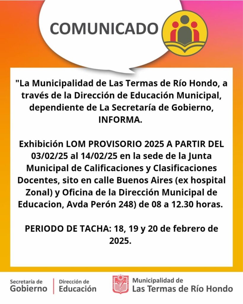 La Dirección municipal de Educación, dependiente de la Secretaría municipal de Gobierno informa sobre la exhibición del Listado de Orden de Mérito (LOM) (provisorio 2025 a partir del 03/02/25 al 14/02/25 en la sede de la Junta municipal de Calificaciones y Clasificaciones Docentes, sito en calle Buenos Aires (ex Hospital Zonal) y la oficina de la Dirección Municipal de Educación sito en avenida Juan Domingo Perón 248 en el horario de 8 a 12.30.