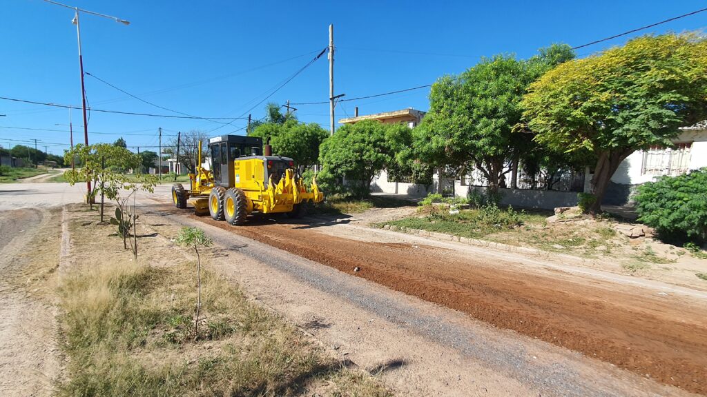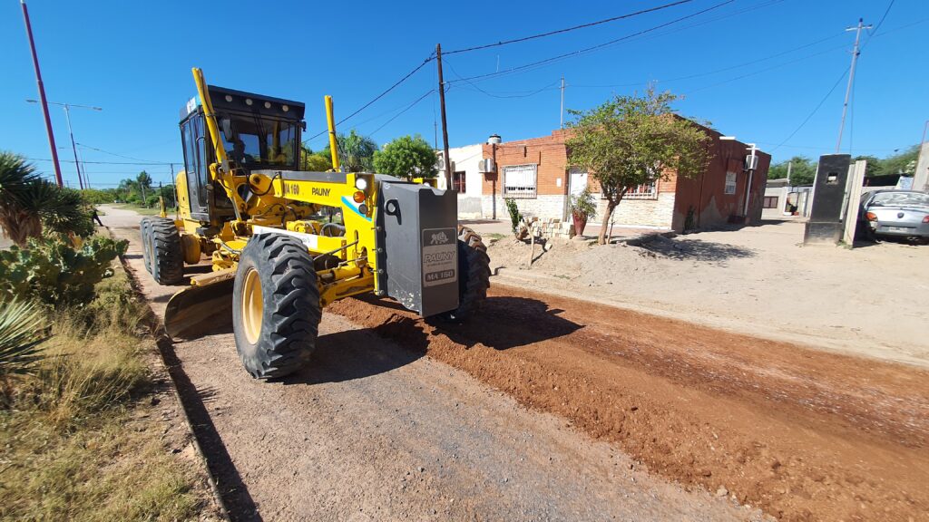 Personal de la Dirección de Obras Públicas realiza el nivelado, perfilado y la colocación de piedra base estabilizada sobre Avenida Carlos Pellegrini del barrio Adela, entre Av. Buenos Aires y Juan D. Perón.